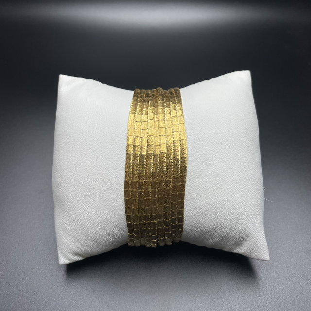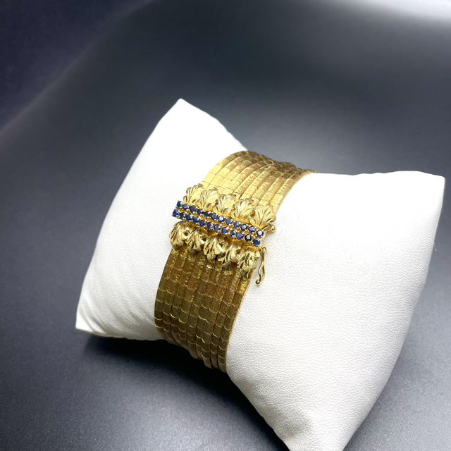 Un gioiello che evoca l’eleganza classica e l’arte dell’alta gioielleria. Questo bracciale in oro è composto da otto sottili nastri finemente lavorati, uniti da una preziosa chiusura decorativa. Il dettaglio distintivo è la fila di 14 zaffiri naturali incastonati sulla chiusura, che aggiungono una nota cromatica profonda e regale. Un accessorio di raffinata bellezza, perfetto per impreziosire con stile le occasioni più importanti.